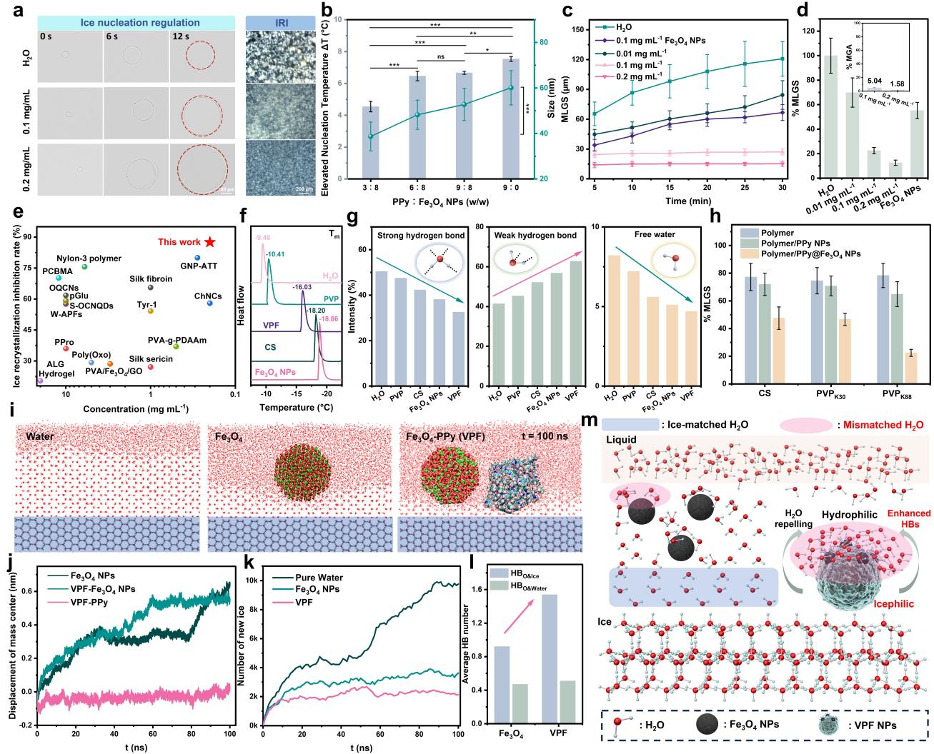 研究中构筑的Janus材料由磁性Fe3O4NPs与光热PPy不对称组合而成,形成一个类似雪人的头部-躯体结构。这一结构在冰-水界面表现出极强的“水化-去匹配”双调控效应:Fe3O4NPs通过强水合作用破坏局部氢键网络,削弱自由水分子与冰界面的匹配;PPy与冰晶表面贴合形成微曲界面,通过Gibbs-Thomson效应抑制重结晶,并驱动水分子由冰界面转移至亲水“头部”。分子动力学模拟进一步揭示了这种Janus构型在冰-水界面的协同抑冰机制,使冰晶平均面积减少高达98.4%(图2)。