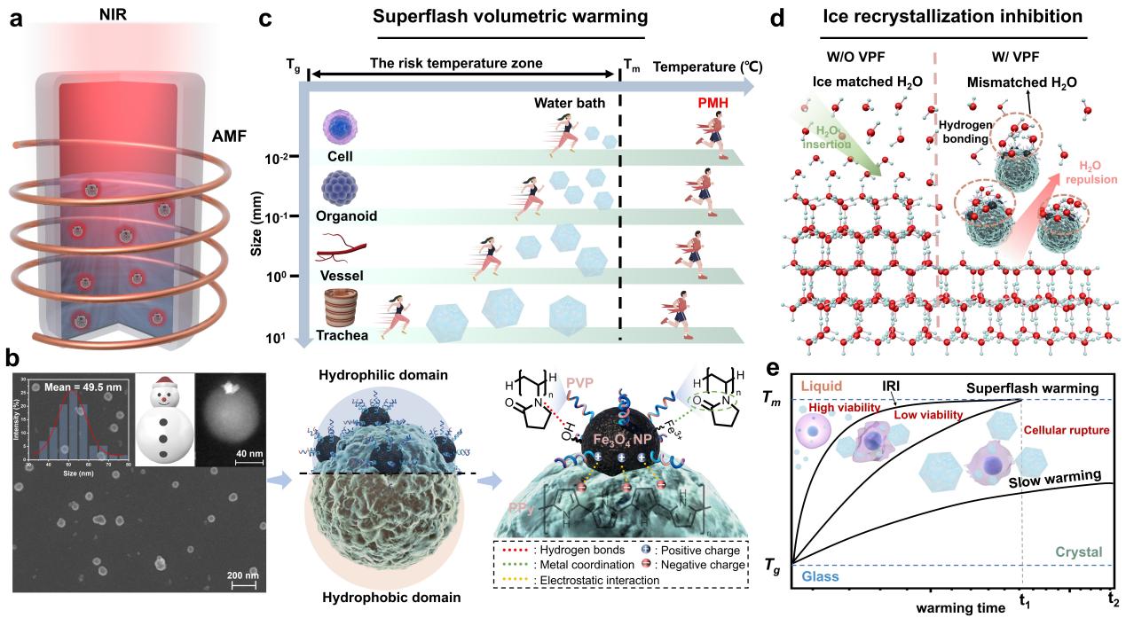 研究成果以“Janus纳米杂化材料实现跨尺度冻存的超快复温与高亲和抑冰效应”(Janus Nanohybrids Enable Superflash Warming and High-Affinity Ice Confinement for Cross-Scale Cryopreservation)为题,于11月29日发表于《先进材料》(Advanced Materials)。