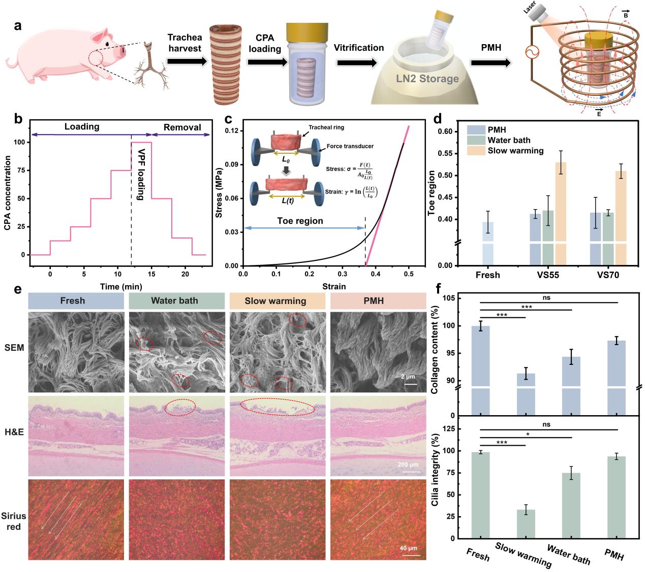 依托这一抑冰-升温双机制,人脐静脉内皮细胞、MSC、神经细胞等多种细胞类型均保持高活性与功能;益生菌在无DMSO情况下仍保有近86%活性;神经细胞球在低浓度冷冻保护剂(CPA)条件下完整保留了3D结构、线粒体功能与后续神经分化潜能;在复杂度更高的50mL级猪气管样本中,组织纤毛、胶原分布及力学特性均与新鲜组织高度一致,显示出对器官尺度的良好适配性(图4)。更为关键的是,VPF具备优异的磁响应特性,可在升温后实现超过98%的快速分离,极大降低了操作难度,便于未来GMP转化。