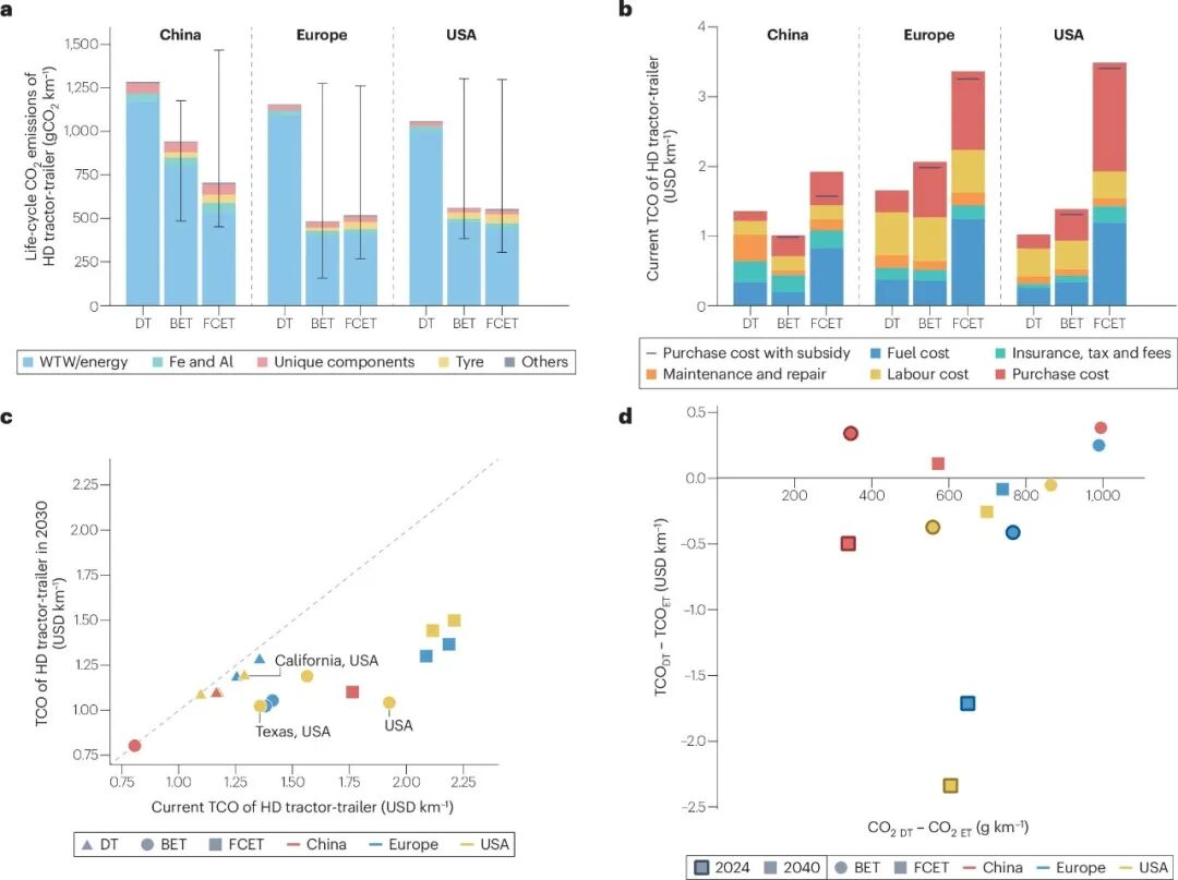 图3.重型牵引车队生命周期排放及总拥有成本:(a)现状年重型牵引车队生命周期CO2排放(b)现状年单车总拥有成本(c)2030年单车总拥有成本与2020年对比(d)中美欧2040年重型牵引车碳减排成本对比