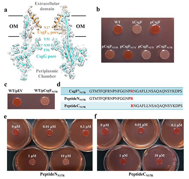 李雪明课题组通过冷冻电镜单颗粒重构的方法解析了大肠杆菌来源的curli生成系统膜上通道复合物CsgFG以及结合了底物的通道符合物CsgFG-CsgAN22的高分辨率结构,分辨率分别达到3.38 埃 和3.34埃。CsgFG复合物的结构显示CsgF与CsgG形成9:9结合的双孔道复合物,CsgF的N端(CsgFN)插入到CsgG的β桶内部与CsgG相互作用。体外蛋白结合实验验证CsgFN与CsgG相互作用,CsgF的C端(CsgFC)与CsgB相互作用。进一步的体外蛋白结合实验显示CsgB结合CsgA,CsgF不结合CsgA。综合电镜结构和体外蛋白结合实验结果,课题组提出了CsgG-CsgFN-CsgFC-CsgB-CsgA的组装方式,阐明了curli纤维如何结合到细菌表面的机制。此外,通过将CsgF的孔道氨基酸Asn17突变成不同侧链性质的氨基酸,课题组发现疏水和带电氨基酸不利于亲水底物的转运,而亲水不带电的氨基酸更有利于底物转运。当把Asn17突变成长链的Arg,缩小了孔道的大小,同样也会影响底物的分泌。基于该实验结果,课题组设计了一个多肽抑制剂PeptideNN17R,刚果红实验结果显示该抑制剂具有较强的抑制作用。