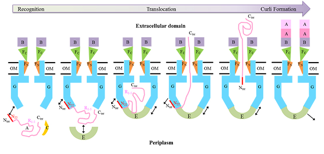 为了在宿主体内或者环境中更好的定植和生存,许多细菌选择聚集在一起形成由蛋白,核酸以及多糖形成的亲水基质包裹的封闭群落。这些由大量亲水大分子包裹的基质叫作生物被膜。细菌的生物被膜在很多感染性疾病中充当重要的致病因素,例如屏蔽型静脉导管,人工瓣膜感染性心内膜炎,以及Foley导管相关性尿路感染。curli菌毛作为生物被膜的重要组成部分,研究curli菌毛生成系统的组装和分泌机制对发展生物被膜相关疾病的治疗方法和治疗药物至关重要。curli生成系统由7个curli特异性相关基因(CsgA,CsgB,CsgC,CsgD,CsgE,CsgF和CsgG)组成,CsgA和CsgB是八型分泌系统的底物,CsgE,CsgF以及CsgG是分泌通道复合物的组成成分,负责特异性识别和分泌天然底物CsgA和CsgB。目前,对于通道复合物是如何组装以及底物CsgA是如何被通道复合物识别并分泌的机制并不清楚。