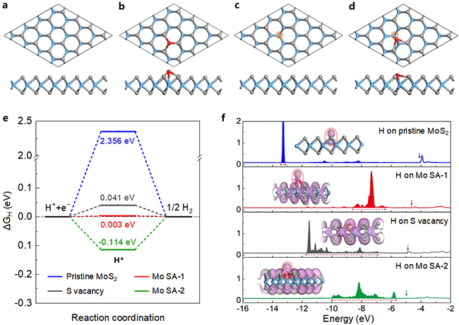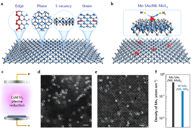 本文提出了一种新型普适的制备单原子催化剂的方法——低温等离子体处理法,解决了将单原子负载在各种单层二维材料上的挑战。通过将二维过渡金属硫族化合物进行处理,得到了负载有不同种类的同源金属单原子的二维材料,其清晰的结构可用作催化机理的研究。结果表明,在保持单层二维材料结构完整的同时,可获得负载在二维材料上密度较高的不同种金属单原子(例如:钼、钨等,1013 atoms cm-2)。同时,结合单片二硫化钼微型电化学反应器的测试,该研究发现了一种二硫化钼电催化剂的新型活性位点,即钼单原子/单层二硫化钼,它具有很小的Tafel斜率(36.4 mV dec-1)和低的过电位(260 mV @400 mA/cm2),是目前报道MoS2基催化剂材料中的最好性能之一。理论计算结果表明了钼单原子/单层二硫化钼上的氢吸附能接近0 eV,具有优异的氢吸附/脱附动力学。以上研究结果对理解电催化分解水过程中的基础科学问题和高效电解水催化剂的设计具有重要指导意义,相关策略有望进一步拓展至其他材料体系和电催化反应中。
