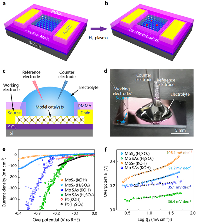 图3.钼单原子/单层二硫化钼的微型电化学反应器模型及电催化性能测试