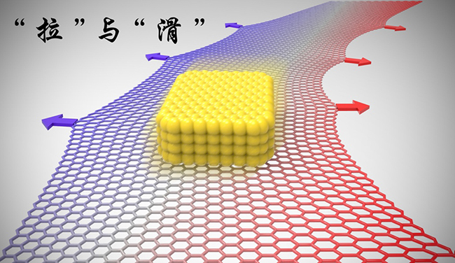 图2.纳米滑块在拉伸的石墨烯基底上近似超润滑的滑动示意图