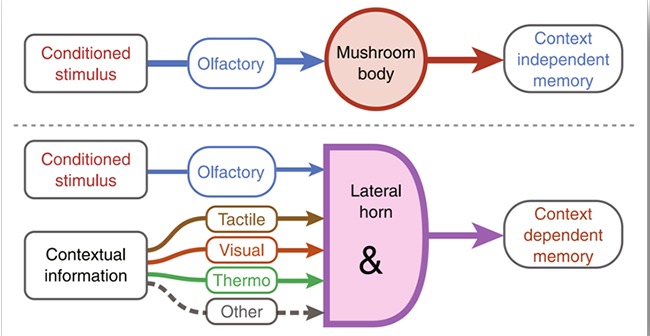 令人出乎意料的是,这种记忆的维持不仅不需要新蛋白质合成,还不依赖于经典的果蝇嗅觉学习记忆中枢:磨菇体(MB, mushroom body),而是依赖于另一个嗅觉高级中枢侧角(LH, lateral horn)。侧角通常被认为是负责嗅觉相关的先天行为,它会与多个脑区连接。在这里,研究人员发现情境依赖记忆的提取需要环境中多种感官信息的匹配,如训练环境与测试环境的光线环境、温度、触觉信息等等。在记忆提取时,这些信息会整合到侧角,共同调控情境依赖的嗅觉记忆提取。这些研究成果揭示了心理学中情境效应的神经机制,并且这种长期维持却又不依赖于固化的记忆形式启发我们重新理解学习与记忆的本质。