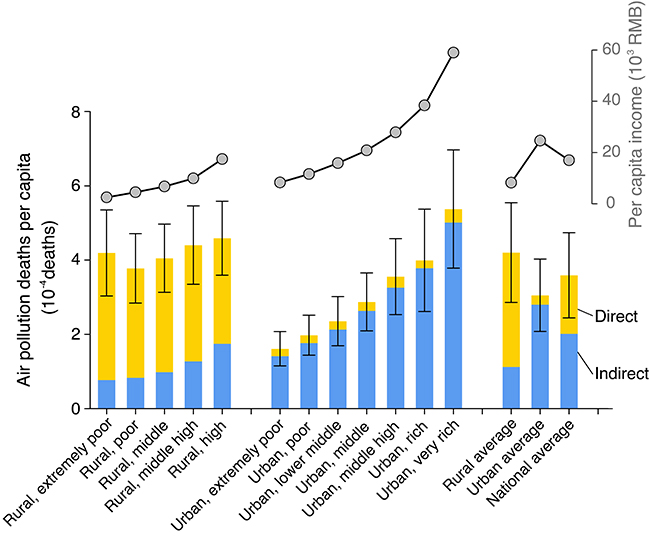 针对这一问题,张强教授研究组领导的研究团队通过耦合排放清单模型、多区域投入产出模型、大气化学传输模型和健康效应模型,同时结合我国城乡居民收入和消费数据,定量评估了2012年中国城乡居民消费引起的PM2.5污染健康损失。研究发现,2012年我国民用燃料消费产生的直接排放和居民消费产品及服务中隐含的间接排放分别贡献了全国PM2.5污染相关过早死亡人数的20%和24%。城市居民消费引起的健康损失主要源于产品和服务消费中隐含的间接排放,且与城市居民收入水平显著正相关。城市最高收入组居民人均消费引起的健康损失是最低收入组的3.3倍。而农村居民消费引起的健康损失主要源于民用固体燃料(煤和生物质)燃烧,与收入水平无明显相关性。尽管城市居民消费水平明显高于农村居民,但农村居民消费引起的健康损失却大于城市居民消费,这主要是因为固体燃料燃烧过程产生大量污染。