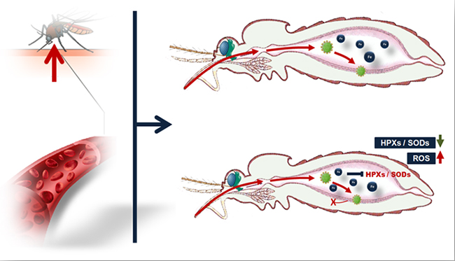 蚊虫可以通过吸血从感染宿主体内获取病毒。在蚊虫吸血后的数天内,感染者的血液被快速消化。与此同时,血液内的病毒感染蚊虫肠道肠道上皮细胞,扩散进入蚊虫体腔,使蚊虫具备传播病毒能力。以上两个过程在时间上高度重合,于是研究者推测宿主血液因子或血液代谢产物可调控病毒在蚊虫体内感染过程,最终决定蚊虫携带并传播病毒的媒介效能。通过一系列筛选,首次发现宿主血清中铁离子含量与蚊虫吸血获取病毒的能力高度负相关,并证明血清铁离子浓度是阻抑蚊虫获取病毒感染的关键负调控因素。进一步研究结果显示,血清中铁离子进入蚊虫肠道后,可被肠道细胞的铁代谢系统直接利用,抑制细胞内的抗氧化酶基因表达,导致蚊虫肠道中活性氧 (ROS) 水平大幅提高,最终阻抑病毒在蚊虫体内的感染扩增 (图1)。