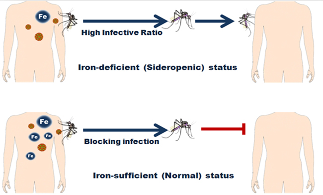 铁缺乏症是一个在自然界中广泛存在的营养学难题。根据世界卫生组织报道,铁缺乏症在非洲、南美洲、东南亚等地区广泛分布。通过比较可以发现,铁缺乏症分布的区域与登革热流行的区域高度重合,因此研究者推测人群的缺铁状态与登革病毒的流行具有密切关系。在随后研究中发现宿主的低铁状态可以促进蚊虫在吸血过程中感染病毒,向低铁宿主体内补铁可以阻断病毒传播。说明向登革病毒疫区的人群中普遍补铁是切断登革病毒在自然界中传播的有效手段,将为登革病毒防治提供全新的防控思路和策略 。