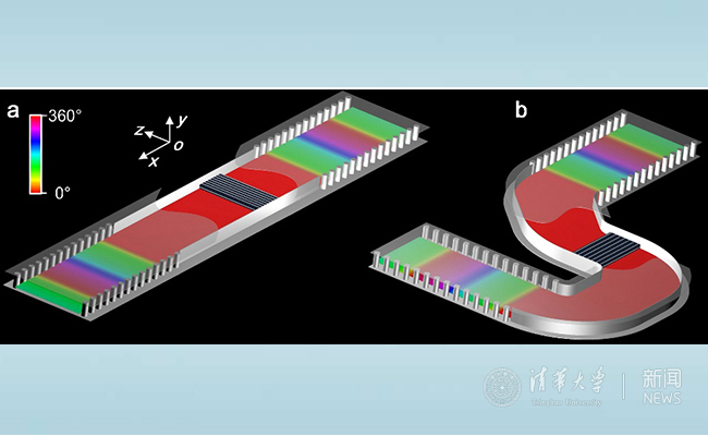 介质集成光学掺杂的概念图:(a)直线型结构,(b)弯折型结构