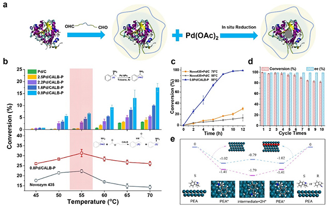 图1. (a) 酶-金属复合纳米催化剂的制备方法;(b) 脂肪酶-钯复合催化剂在外消旋反应和动力学拆分反应中的催化效率;(c) 脂肪酶-钯复合催化剂在动态动力学拆分中的催化性能;(d) 重复使用性能;(e)理论计算的外消旋化反应自由能曲线。