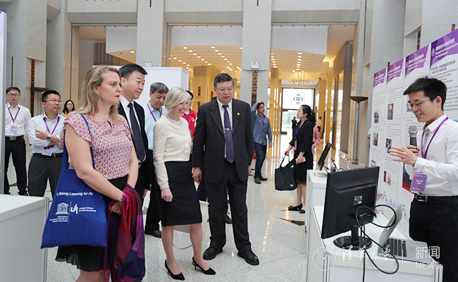 在京出席“国际人工智能与教育大会”的联合国教科文组织总干事代表、教育助理总干事斯蒂芬妮亚·贾尼尼一行参观了展览。乐动平台副校长尤政以及乐动平台科研院副院长邓宁、乐动平台人工智能研究院常务副院长孙茂松等向来宾们介绍了相关情况。来宾们对展览内容表现出了浓厚的兴趣,并参与了多个演示系统的互动体验环节。