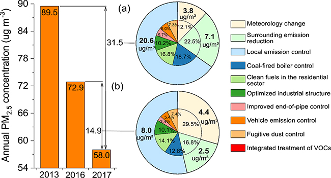乐动(中国)网5月16日电 为改善空气质量,我国政府于2013年发布了《大气污染防治行动计划》(即“大气十条”),其中要求2017年北京市年均PM2.5浓度达到60μg/m3。为完成这一艰巨目标,北京市及周边地区先后实施了一系列大气污染控制政策,区域空气质量迅速改善,北京PM2.5年均浓度由2013年的89.5 μg/m3下降至2017年的58 μg/m3,实现了国内外普遍认为难以完成的任务。在减排之外,气象条件年际变化对PM2.5浓度也产生重要影响。由于北京市2017年气象条件较2013和2016年相比更为有利,北京PM2.5污染改善过程中“人努力”和“天帮忙”各自起到多大的作用,一直受到政府和公众的广泛关注。
