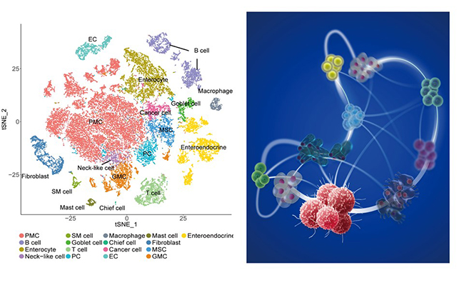 图1. 胃炎癌转化单细胞图谱。左图为本研究获得的胃炎癌不同阶段50,000余个单细胞特征;右图为从图谱中解析出的包括胃癌极早期细胞在内的胃炎癌转化重要细胞类型及其网络关联
