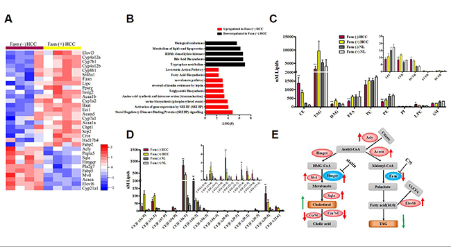 (A-B) Microarray数据分析 (C-D)脂质组学分析 (E)甘油三酯和胆固醇代谢调控总结