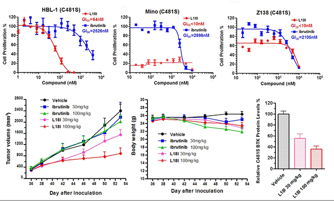 图2:L18I药效学研究;A L18I和依鲁替尼对BTK C481S突变型HBL-1细胞的生长抑制活性;B L18I和依鲁替尼对BTK C481S突变过表达型MCL (Mino or Z138)细胞的生长抑制活性;C 与依鲁替尼相比,L18I在BTK C481S突变的小鼠肿瘤(HBL-1)模型中显著抑制肿瘤的生长并对小鼠体重无明显影响;D L18I处理后,小鼠肿瘤组织 C481S突变的BTK蛋白水平。