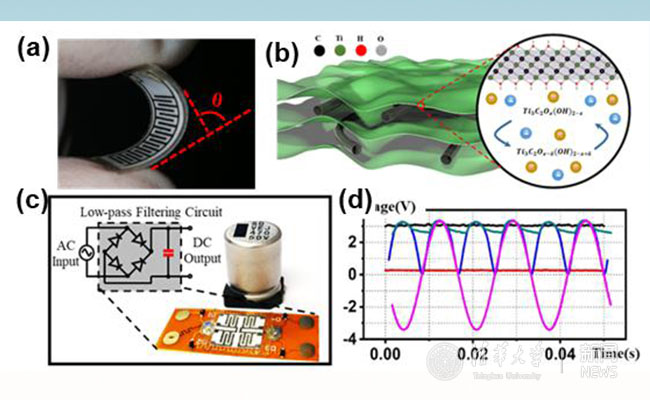 高频微型超级电容器 (a)器件,(b)电极结构设计,(c)和(d)在电源滤波电路中的应用