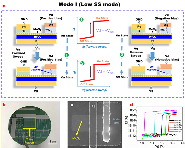 在模式一中,通过施加不同极性的漏极偏置和不同方向的栅极扫描电压,调控漏极和沟道间阻变层电场大小和方向,使得阻变层中的导电细丝导通和断裂。在其导通和断裂的瞬间,沟道电流发生突变从而实现超低的亚阈值斜率(图1a)。利用化学气相淀积生长的大面积二硫化钼薄膜使得该器件可达到晶圆级制备规模 (图1b)。其器件结构如图1c所示,在该器件中获得了2.26 mV/dec的超低亚阈值斜率(图1d)。