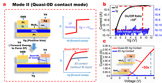 图 2. (a)二硫化钼导电细丝晶体管模式II运行示意图;(b)模式二下该晶体管的栅控电流传输曲线和栅极漏电流;(c)准零维结构晶体管(模式二)和对照组传统三维接触的开态电流对比。