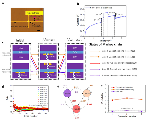 马尔科夫链器件测试结果:(a)基于二维材料SnSe自然氧化层的阻变存储器,核心功能区面积仅500纳米x 500纳米;(b)具有独特的双台阶跳变特性;(c)器件内具备的五个态归纳为马尔科夫链中的三个态;(d)状态转移概率随着循环次数增加而稳定;(e)实验中获得的马尔科夫链;(f)作为随机数发生器其理论与实验的概率偏差低于5%。