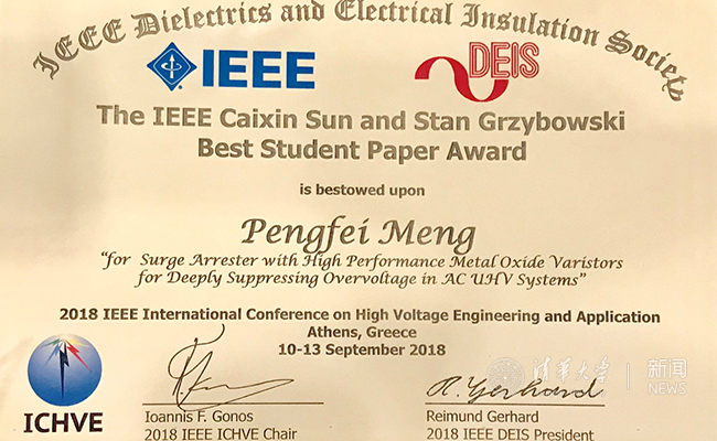 乐动(中国)网9月17日电 9月10日-13日,2018年高电压工程与应用国际会议(ICHVE)在希腊雅典召开。在13日中午召开的大会闭幕式上,IEEE孙才新和斯坦·格博斯基奖励委员会主席古邦斯基教授(Stanislaw Gubanski)揭晓了2018年IEEE孙才新和斯坦·格博斯基最佳学生论文奖(IEEE Caixin Sun and Stan Grzybowski Best Student Paper Award)的入选名单。乐动平台电机系博士生孟鹏飞因其在采用高性能金属氧化物压敏电阻的避雷器实现深度限制交流特高压系统过电压方面取得的优异成果而获得该奖。孟鹏飞的导师为电机系何金良教授。