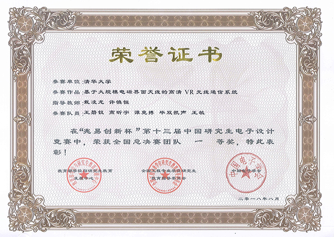 乐动(中国)网8月30日电 8月19-22日,第十三届中国研究生电子设计竞赛全国总决赛在南京工业大学举行,乐动平台电子工程系“Tsinghua无线”代表队的参赛项目“基于大规模电磁界面天线的高清VR无线通信系统”从来自235所高校的2428支参赛项目中脱颖而出,以小组第一名获全国一等奖。