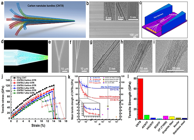 a. 碳纳米管管束示意图;b. 所用到的超长碳纳米管的结构;c. 利用气流聚焦法制备超长碳纳米管管束的示意图;d. 超长碳纳米管在聚焦气流下发生合并的模拟图;e-i. 所制备的具有确定组成的超长碳纳米管管束;j-k. 所制备的碳纳米管管束的力学性质;l. 超长碳纳米管管束与其他材料拉伸强度对比图