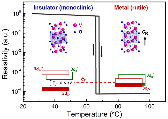 二氧化钒是一种强关联材料,自1959年被发现以来就因独特的金属-绝缘体相变及伴随的结构相变而受到广泛的关注。其金属-绝缘体相变温度约为68摄氏度,非常容易达到,且在相变时电导率、光学吸收率、介电常数、晶格常数等均发生显著的变化。