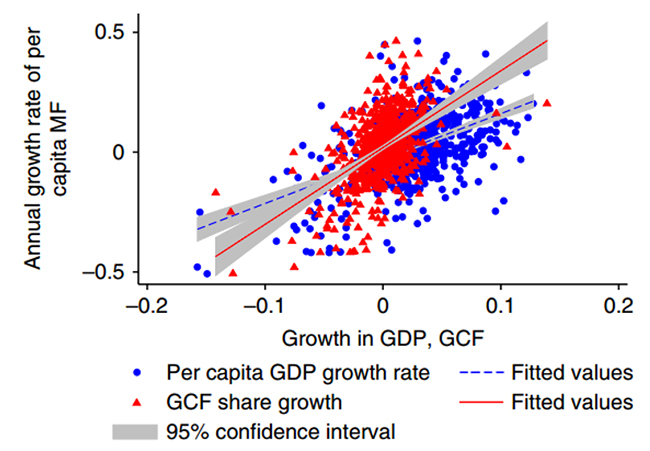 人均金属足迹与人均GDP、资本形成总额(Gross Capital Formation, GCF)在GDP中占比的关系图。图中蓝色圆点表示人均金属足迹的年增长率与人均GDP年增长率之间的关系;红色三角点表示人均金属足迹年增长率与GCF在GDP中占比的年变化量的关系。图中包括43个国家1996-2013年的774个样本点。阴影部分表示线性拟合的95%置信区间。