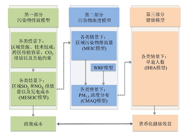 该研究将中国电力行业多区域优化及其环境影响模型(Multi-regional model for Energy Supply system and their Environmental ImpaCts,简称MESEIC)、空气质量模型和健康影响综合评估模型模型进行链接,并基于以上模型完整地呈现了不同气候政策对碳排放-常规污染物排放-空气质量-人类健康影响的全过程。