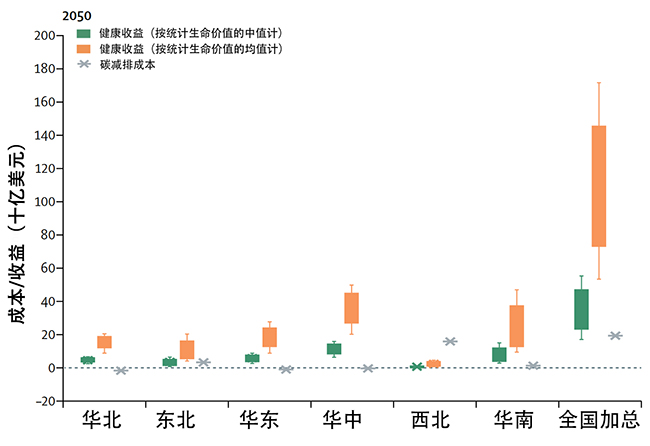 然而,目标对于不同区域的人群健康影响存在显著差别。中国电力行业实现自主减排贡献目标将显著改善华北、华中、华东、东北以及南方地区的能源结构,同时也带来空气质量的改善以及显著的健康协同效应。但是,作为能源资源中心,西北地区承担了电力输出的责任——为其他地区生产低成本的煤电,若其煤电技术没有匹配足够的大气污染物控制技术,将导致该地区空气质量恶化并遭受健康损失。