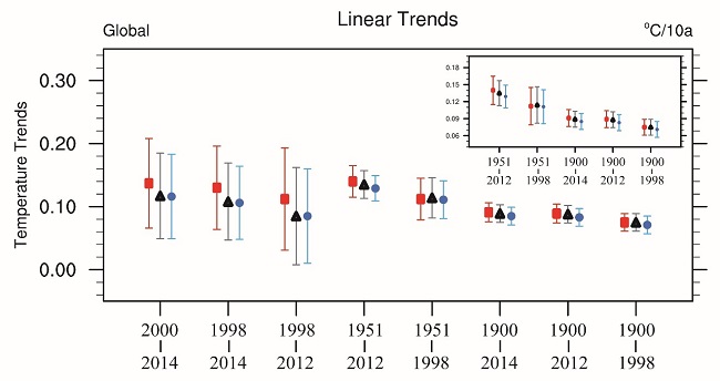 不同时段全球平均地面气温的变暖趋势及不确定性范围。右上角小图为后5个时段的放大图。黑色实心三角为用于重建的NOAA年平均气温变化率,蓝色实心圆为原始的NOAA月平均气温变化率,红色实心圆为包含本文重建的北极温度后的全球平均气温变化率。Bar为90%的信度范围。(单位:℃/10年)