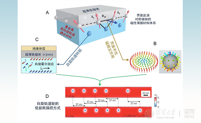 图A所示为具有界面反演对称破缺的磁性双层膜。图B所示为该材料体系中的奈耳态斯格明子(左)。及其拓扑图像(右)。该材料体系中的强自旋霍尔效应(图C),可以用来高效操控磁性斯格明子(图D)。