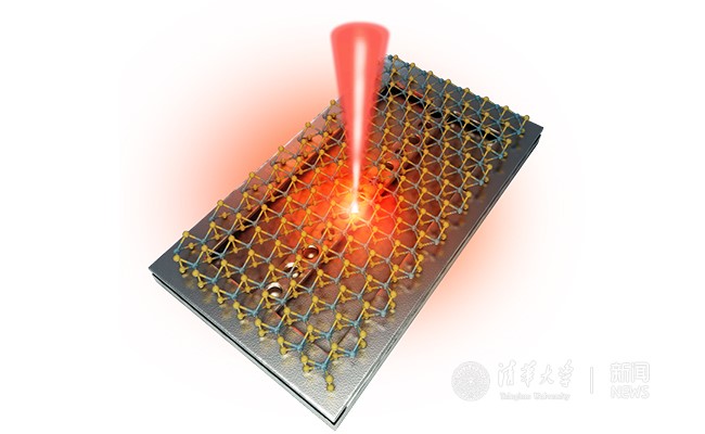 网状结构示意单层二维材料,底下是一个用作激光腔的硅纳米悬臂。