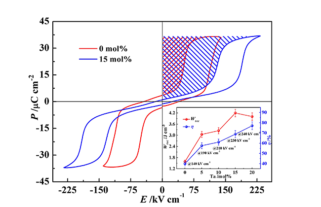 图1 Ag(Nb1-xTax)O3陶瓷的电滞回线、可释放储能密度和能量效率。