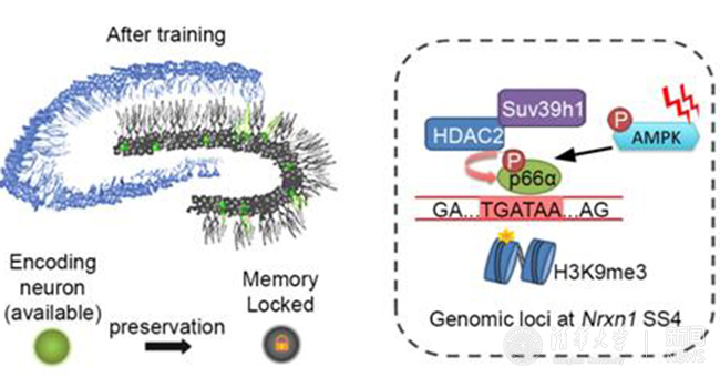 在乐动平台生命学院、医学院的多个实验室的帮助下,研究者进一步发现了从神经元激活到膜蛋白剪切体变化的细胞信号通路。他们的研究揭示了神经元活动会激活腺苷酸活化蛋白激酶(AMPK)通路,从而磷酸化DNA的结合蛋白p66α。结合在神经轴突连接素1(Nrxn1) 可变剪接位点4的p66α蛋白在磷酸化后招募了表观遗传调控因子HDAC2(组蛋白去乙酰化酶2)和Suv39h1,并建立了抑制性的组蛋白修饰。这个组蛋白微环境会通过对转录过程中耦联的RNA剪接过程进行调控,从而形成稳定的新剪切异构体蛋白。当人为干预这个细胞过程(Suv39h1基因敲除小鼠),使得神经元活动诱发的表观修饰印迹消失时,小鼠已经形成的记忆的稳定性下降,容易被新的学习内容覆盖。