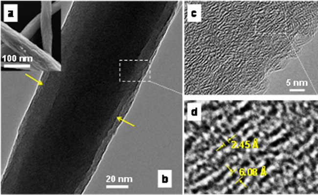 芯-壳纳米纤维结构表征结果:(a)纤维的表面形貌图,(b)纤维的TEM图,(c)和(d)纤维上的原子定向排布。