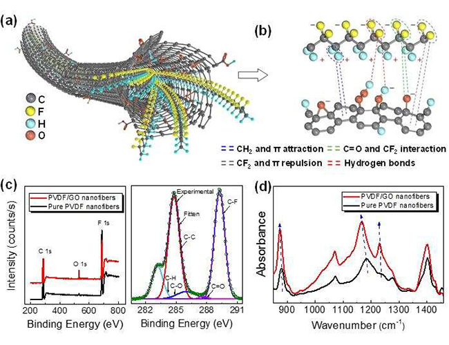 随着可穿戴电子和能量收集领域的兴起,压电聚合物材料再度引起研究者的关注。因传统的压电聚合物受限于压电材料本身的半晶态(或者非晶态),导致其压电常数远低于压电陶瓷等材料。该项研究首次创造性地设计了一种芯-壳结构,利用外层包裹的氧化石墨烯来使中间的聚合物链从非极性的α相转为极性的β相,并且利用纳米纤维的一维结构和机械拉伸,实现压电β相聚合物长链单向排布,并且在外界电场的调控下,实现具有一致的极化方向,从而极大地提高了纳米纤维的压电性能。