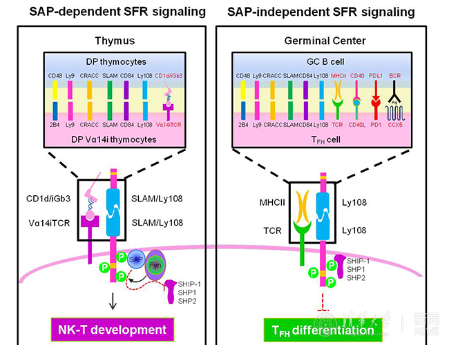 淋巴细胞活化信号分子(SLAM)家族受体具有传递淋巴细胞活化信号分子结合蛋白(SAP)依赖和非依赖信号的能力,淋巴细胞活化信号分子(SLAM)家族受体传递淋巴细胞活化信号分子结合蛋白(SAP)依赖信号对自然杀伤T细胞(NKT)细胞发育至关重要,淋巴细胞活化信号分子(SLAM)家族受体或者淋巴细胞活化信号分子结合蛋白(SAP)缺失均导致自然杀伤T细胞(NKT)细胞发育受阻(左);淋巴细胞活化信号分子结合蛋白(SAP)依赖的淋巴细胞活化信号分子(SLAM)家族受体信号对辅助性滤泡T(TFH)细胞发育可有可无,但对于X连锁淋巴组织增生综合征(XLP)病人,淋巴细胞活化信号分子(SLAM)家族受体转变成抑制性受体,导致辅助性滤泡T(TFH)细胞发育受损,体液免疫缺陷(右)。