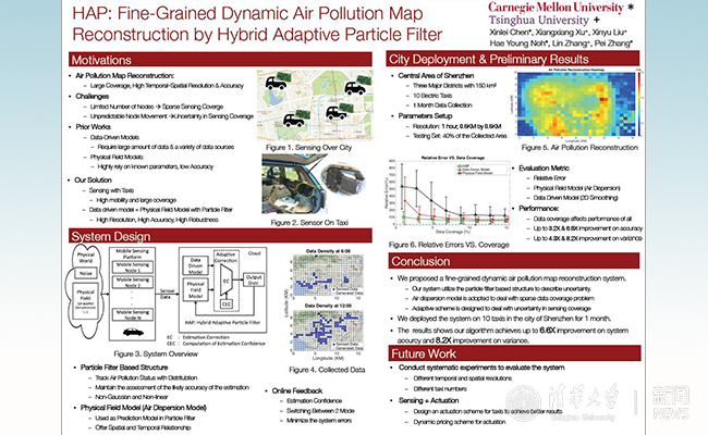 荣获最佳海报提名奖(best poster runner-up award)的论文《HAP -混合自适应粒子滤波器实现动态高精度空气污染信息场重建》“HAP- Fine-Grained Dynamic Air Pollution Map Reconstruction by Hybrid Adaptive Particle Filter”作者分别为:陈鑫磊(卡耐基梅隆大学)、徐祥祥(乐动平台电子工程系)、刘新宇(乐动平台电子工程系)、卢海永(Hae Young Noh,卡耐基梅隆大学)、张林副教授(乐动平台电子工程系、清华-伯克利深圳学院),张旆副教授(卡耐基梅隆大学)。论文研究解决重建城市范围高时间和空间分辨率的动态空气污染信息场问题。提出通过将自主设计的低成本空气检测系统安装在出租车上,实时采集城市空气污染数据。基于传统的粒子滤波理论,本研究设计了一套混合自适应结构,融合了数据模型和物理模型的优势,实现了在数据稀疏且传感覆盖不确定的情况下,高精度实时恢复空气污染信息场。