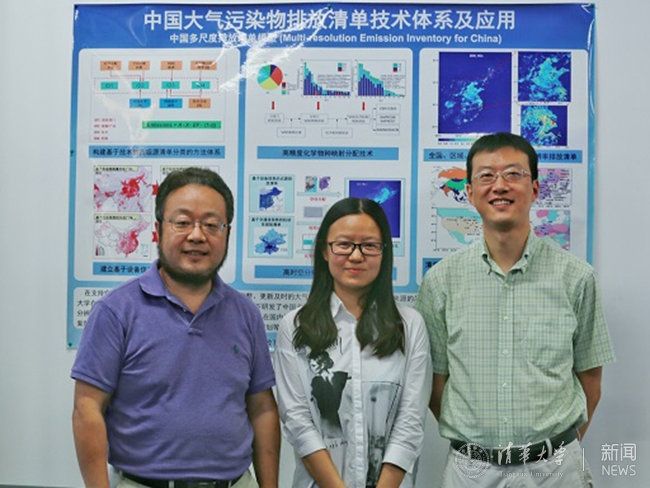 同丹与导师贺克斌院士(左一)、张强教授(右一)合影。