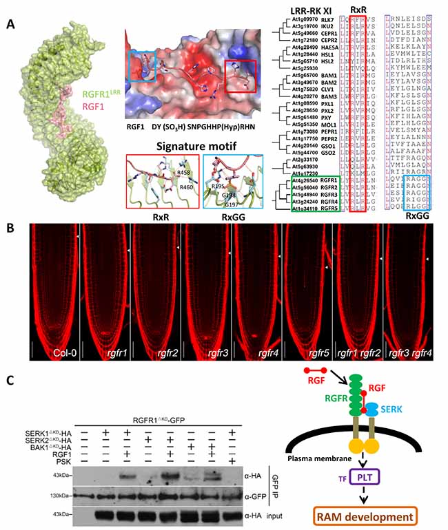 A:RGFR1-RGF1复合物晶体结构及植物小肽类激素识别规律B:RGFRs调控根分生区生长发育C:RGF肽激素通过激活受体RGFR和共受体SERK向细胞内传递信号调控根RAM发育。