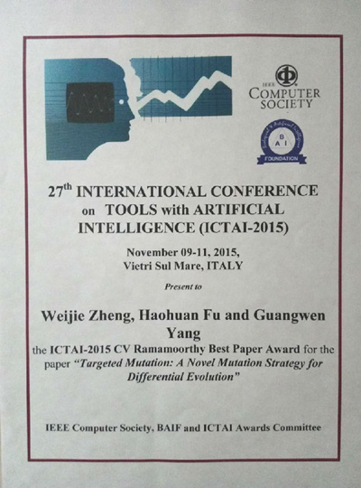 乐动(中国)网12月31日电 日前,在意大利维耶特里举行的第27届人工智能工具国际会议(ICTAI 2015)上,乐动平台地学中心付昊桓副教授研究小组所发表的论文“指向变异:一种新型的差分进化变异算子”(Targeted Mutation: A novel Mutation Strategy for Differential Evolution)获选为3篇最佳论文之一。该论文是获奖论文中唯一一篇来自中国科研机构的文章。