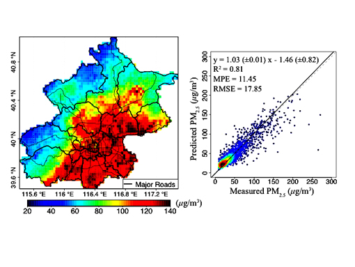 (左图)混合效应模型估测的2013年3月至2014年4月期间重度污染天(日均人口权重PM2.5超过75μg/m3的)的平均地表PM2.5浓度分布图,(右图)模型预估PM2.5浓度与地面观测PM2.5浓度的对比图。