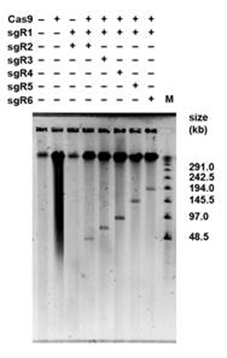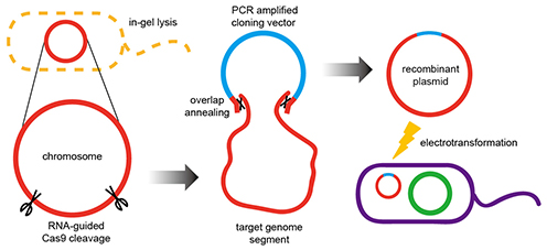 分子克隆技术已被广泛应用于现代生物学的各个领域,但传统的PCR(聚合酶链式反应)技术通常很难一步得到15 kb以上的片段,传统的限制性核酸内切酶识别位点仅6-8个碱基,对生物基因组不能有效实现特异性,因此对于较长目标片段的克隆或合成始终存在阳性率低,步骤复杂,成本高等问题。近年来人们在细菌中发现的CRISPR系统可以实现对外源序列的特异性识别和有效切割,在此基础上,科学家们开发出许多基因编辑、基因表达调控,体内成像等工具。然而对该系统的体外应用则鲜有报道。朱听课题组利用体外转录制备的sgRNA和表达纯化的Cas9蛋白特异性酶切目标全基因组,并通过同源序列互补将长达100 kb的目标片段一步连接到细菌人工染色体上实现特异性克隆。通过脉冲场电泳可以清晰观察到目标大片段从全基因上的有效分离,其克隆效率可与普通短片段克隆相当。