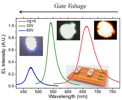 石墨烯材料,具有独特的物理性质,在可控光子/光电子器件等课题中被广泛应用。但由于其零带隙和非发光复合率高的特性,石墨烯基发光器件是学术界的一个难题和长期空白领域。任天令教授课题组创新性的通过激光直写技术,在氧化石墨烯和还原石墨烯的界面处获得了半还原态的srGO材料。该材料兼备石墨烯的高导电性和氧化石墨烯的宽带隙特征。通过构建面内栅极结构,对栅极施加电压可以调制srGO的费米能级,从而实时调控石墨烯LED发光的中心波长。该LED还具有亮度高和可制成柔性器件的特点,是现代LED显示、照明和通信技术的理想元件。