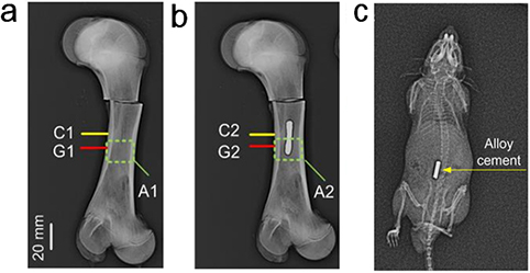 图为液态合金骨水泥填充于猪骨和小鼠皮下的X射线影像。