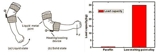 与此同时,基于液态金属的液-固相转换机制,刘静教授及其博士后邓月光还在国际上首次提出并证实了一种“液态金属人体外骨骼技术”,相应论文发表于ASME Journal of Medical Devices(美国机械工程师学会医疗器械杂志),论文题为Flexible Mechanical Joint as Human Exoskeleton Using Low-Melting-Point Alloy(基于液态金属的人体外骨骼柔性关节)。这种新概念型机械关节存在柔性和刚性两种工作状态。平时工作状态下,低熔点金属吸热熔化并处于液态,柔性程度高,在体穿戴舒适感好,整个机械关节因此可在柔性关节处灵活弯折或扭转,以作为人体外骨骼执行搬运重物动作;一旦需要执行高强度任务如上肢关节运动至需要承重的位置时(人体外骨骼保持搬运动作),关节内的液态金属会在半导体制冷器作用下快速固化变硬,机械关节于是切换至刚性固体状态,整个机械关节装置从而可承受巨大的拉伸或扭转应力,这就有效地缓解了肘关节需要承受的重物拉力。整个工作过程无驱动部件,响应迅速,灵活性好。新技术有些类似于好莱坞科幻影片《钢铁侠》的应用场景,预计在高柔性、高强度人体外骨骼领域具有广阔的发展前景。