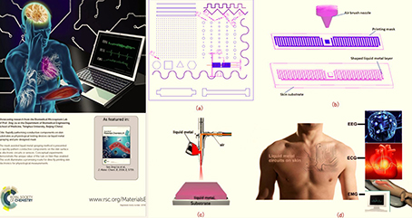 此外,基于实验室近年来提出的液态金属印刷电子学概念,刘静小组还建立了一种独特的人体皮肤电子电路成型方法——室温液态金属模板喷印技术,研究成果以封底文章形式发表于Journal of Materials Chemistry B (材料化学杂志)上,论文题为Rapidly Patterning Conductive Components on Skin Substrates as Physiological Testing Devices via Liquid Metal Spraying and Pre-designed Mask(在皮肤上基于液态金属模板喷印方法快速构建用以检测生理信号的导电元件)。文章第一作者为医学院博士生郭藏燃。