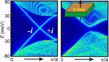 左图为二维拓扑晶体绝缘体受镜面对称性保护的拓扑边缘态。右图为可以通过外加电场,打开边缘态的能隙,从而实现电场调控的拓扑边缘态,为实现拓扑晶体管提供了物理基础。